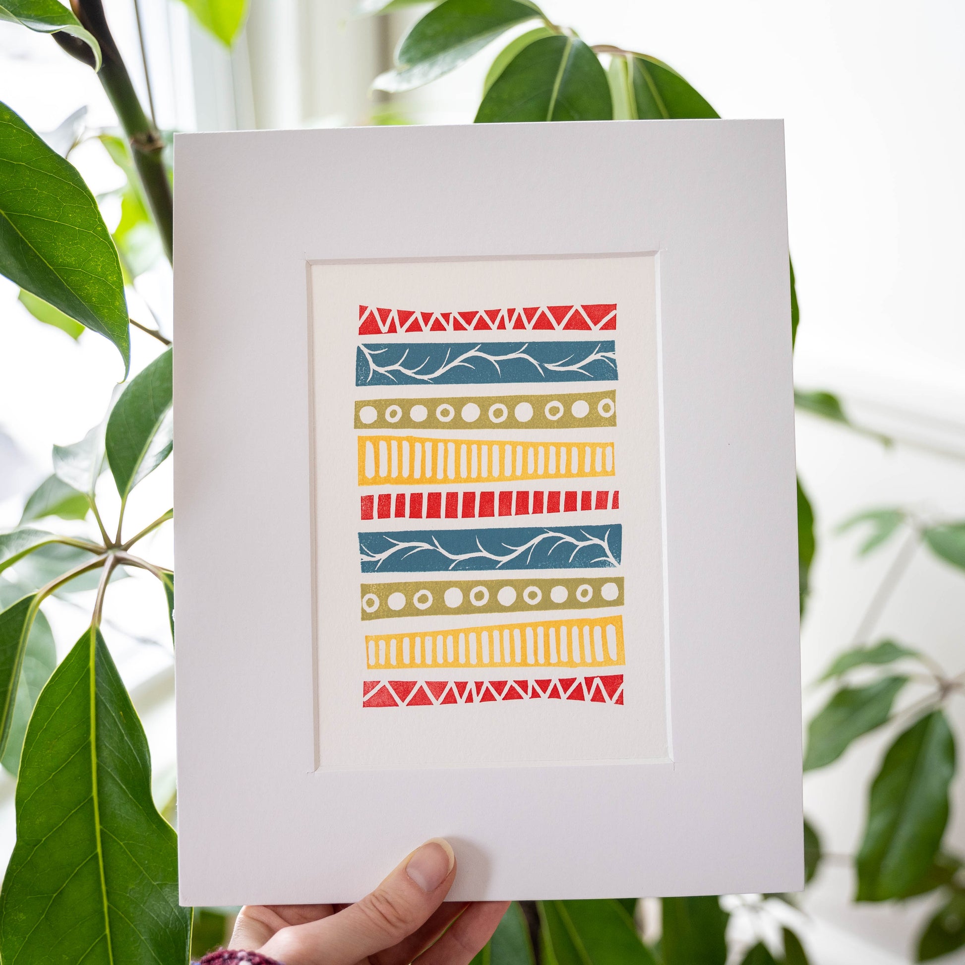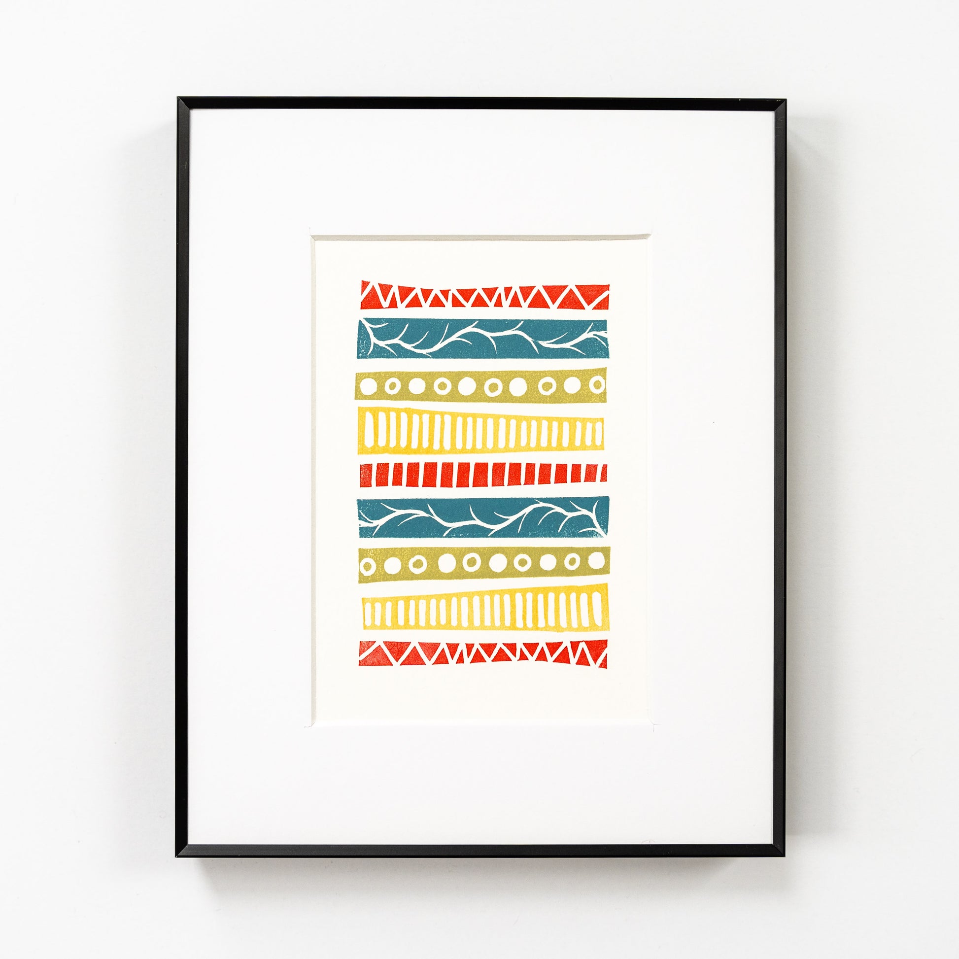 This abstract piece was printed with an original set of hand-carved bocks. Each block is individually hand-stamped, making this print completely unique.