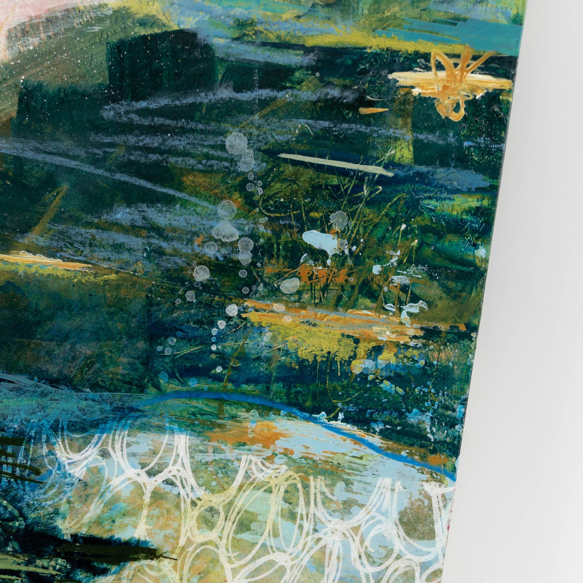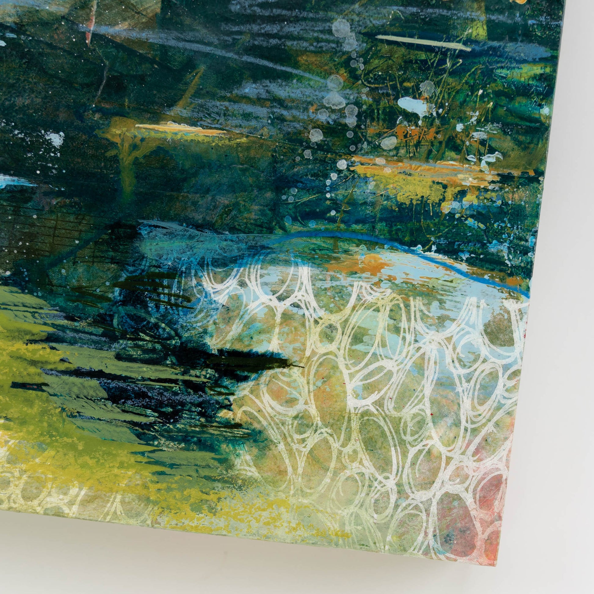 Paint, ink, and collage pieces were applied in layers to create this bold abstract landscape painting.