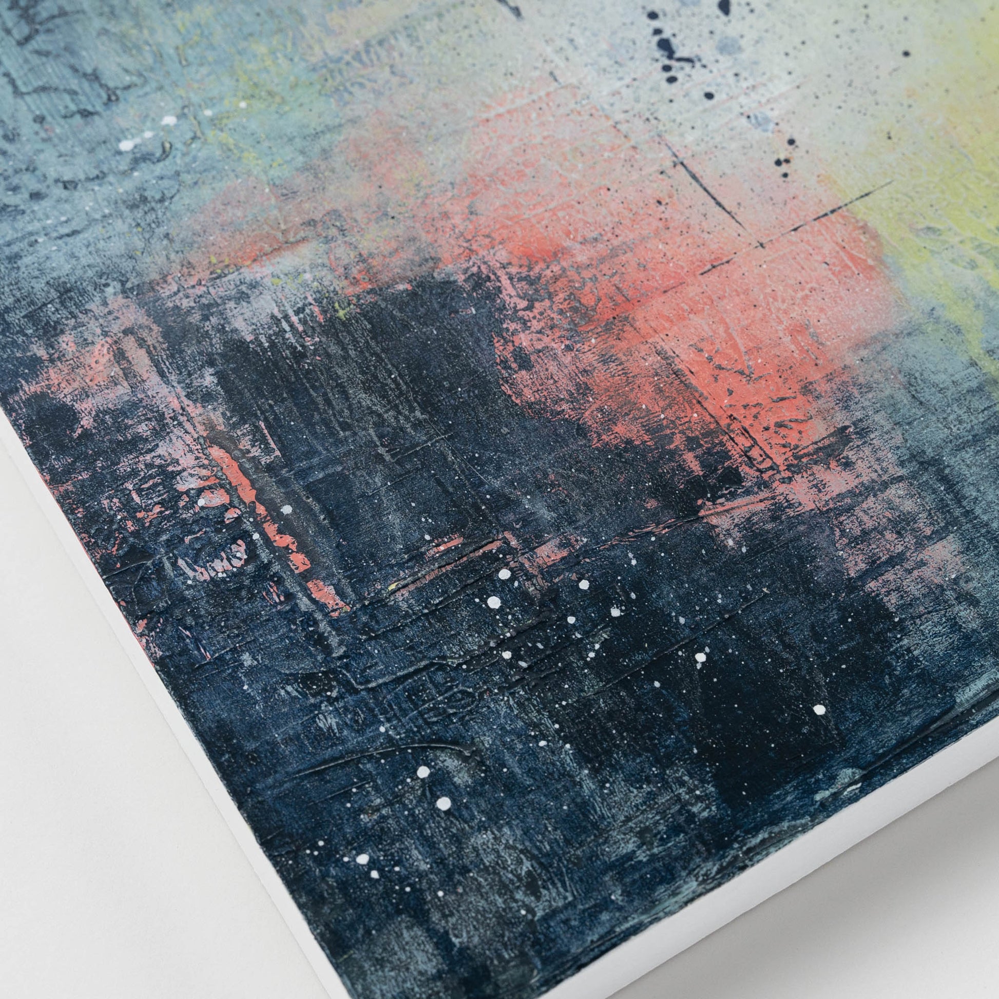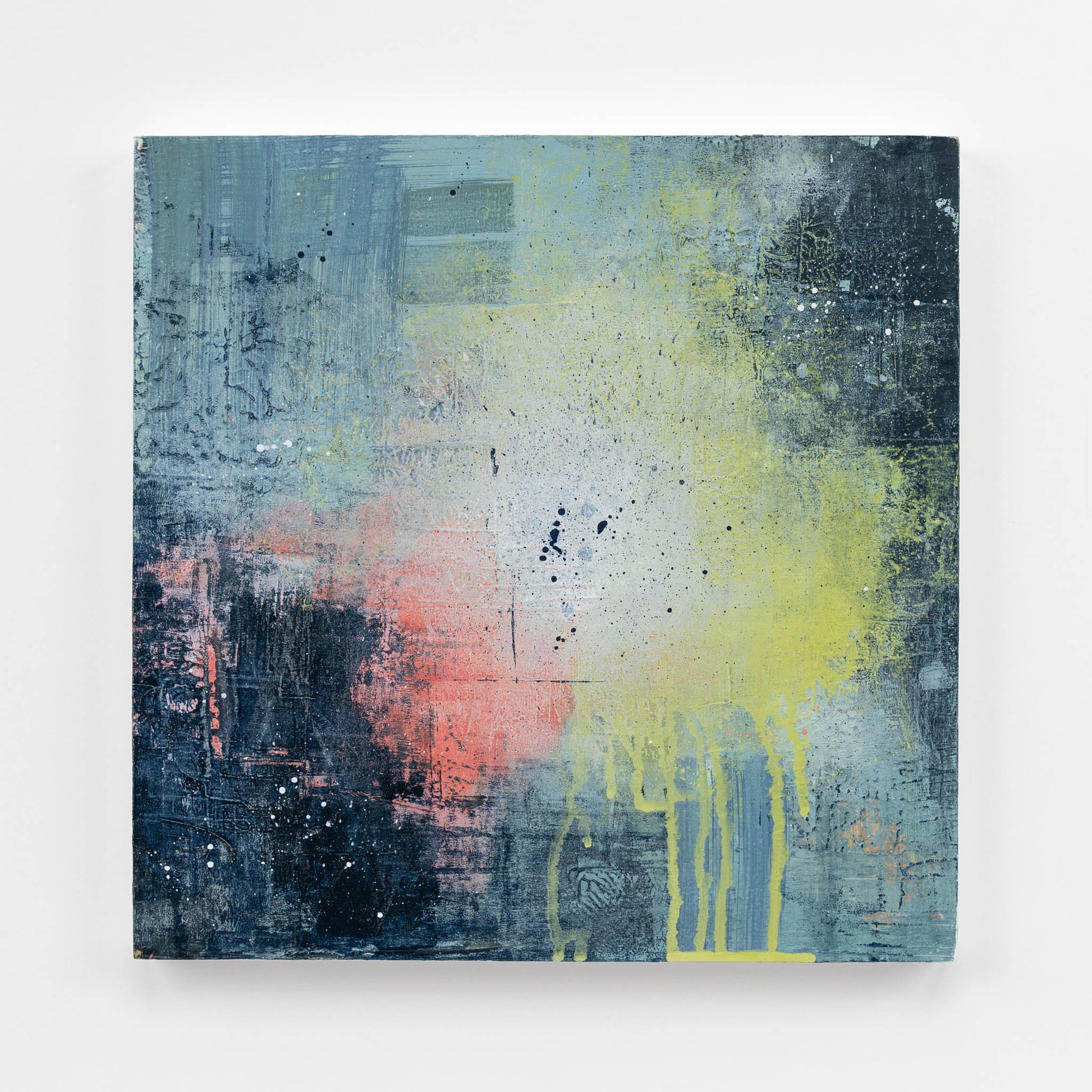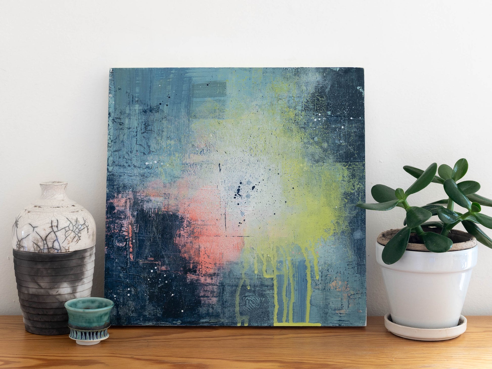 Inspired by early summer gardens on dewy mornings, this painting consists of many layers of acrylic paint and ink applied using a variety of techniques. Each layer adds texture and a sense of history to the painting, creating many small, yet exciting moments to be discovered.
