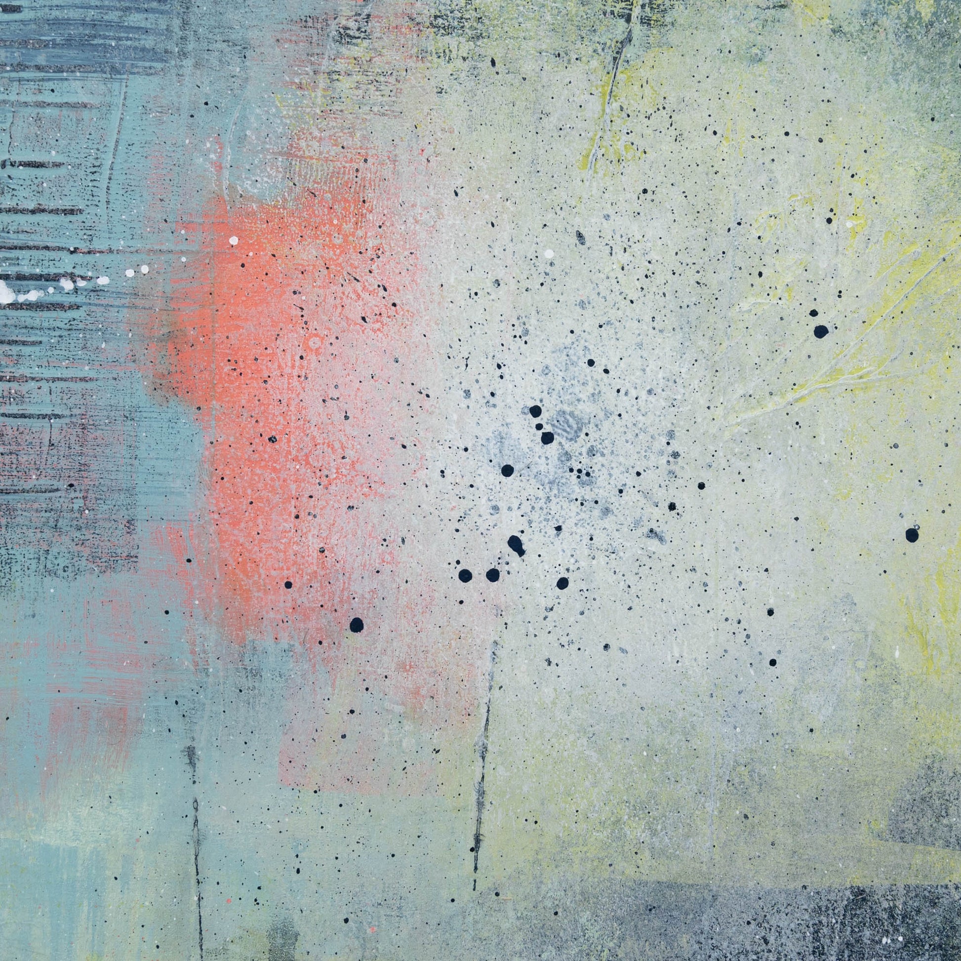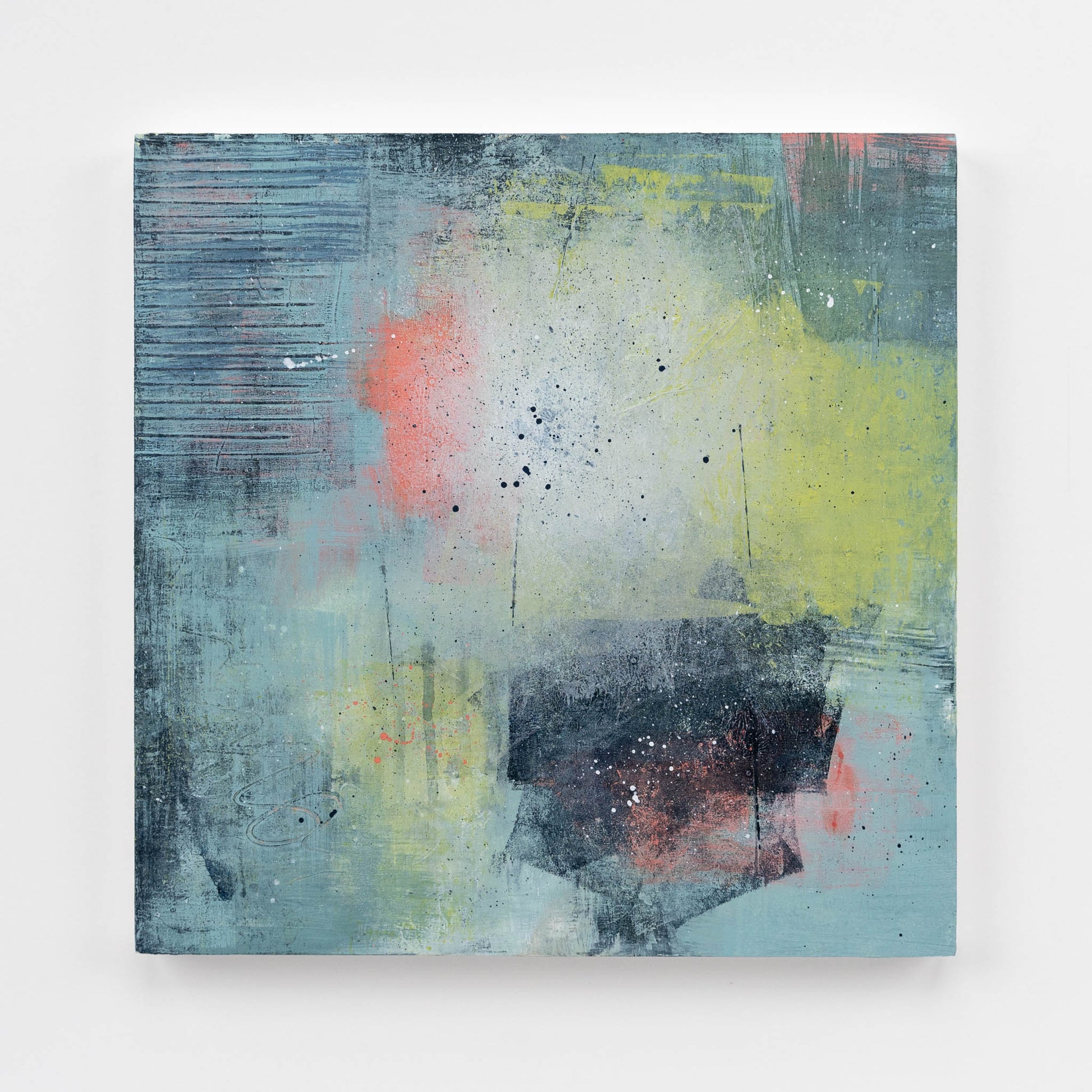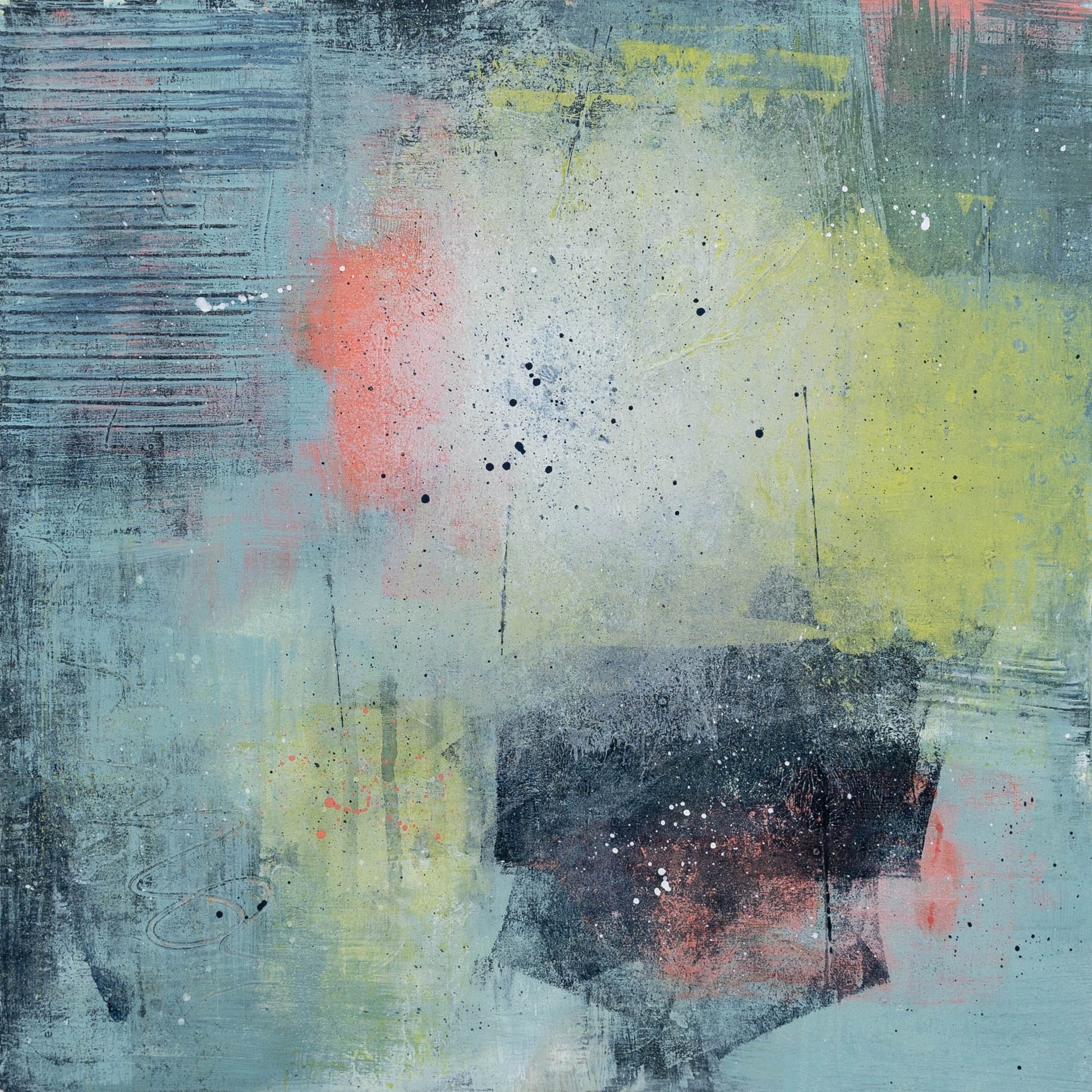 Inspired by early summer gardens on dewy mornings, this painting consists of many layers of acrylic paint and ink applied using a variety of techniques. Each layer adds texture and a sense of history to the painting, creating many small, yet exciting moments to be discovered.