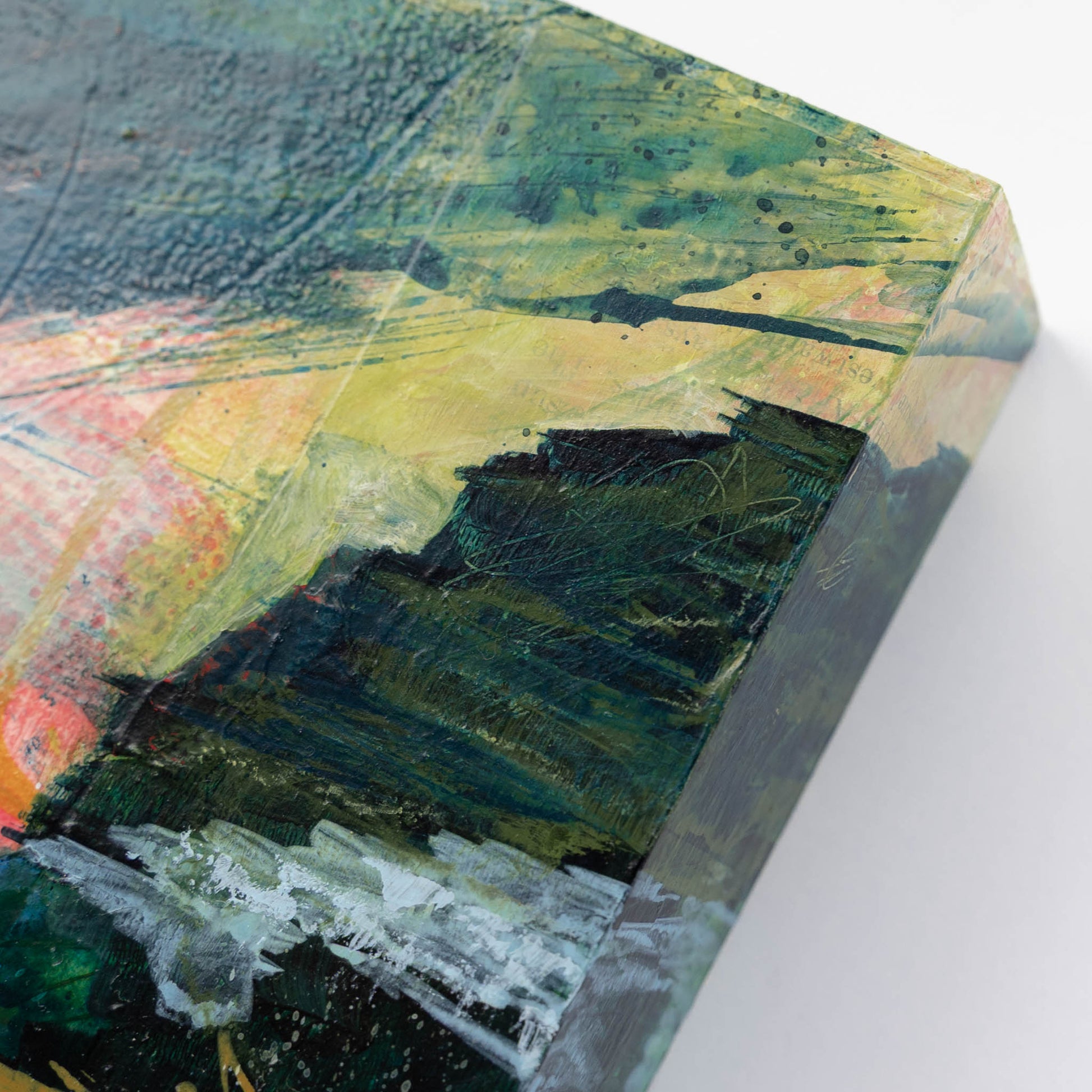 Paint, ink, and collage pieces were applied in layers to create this bold abstract landscape painting.