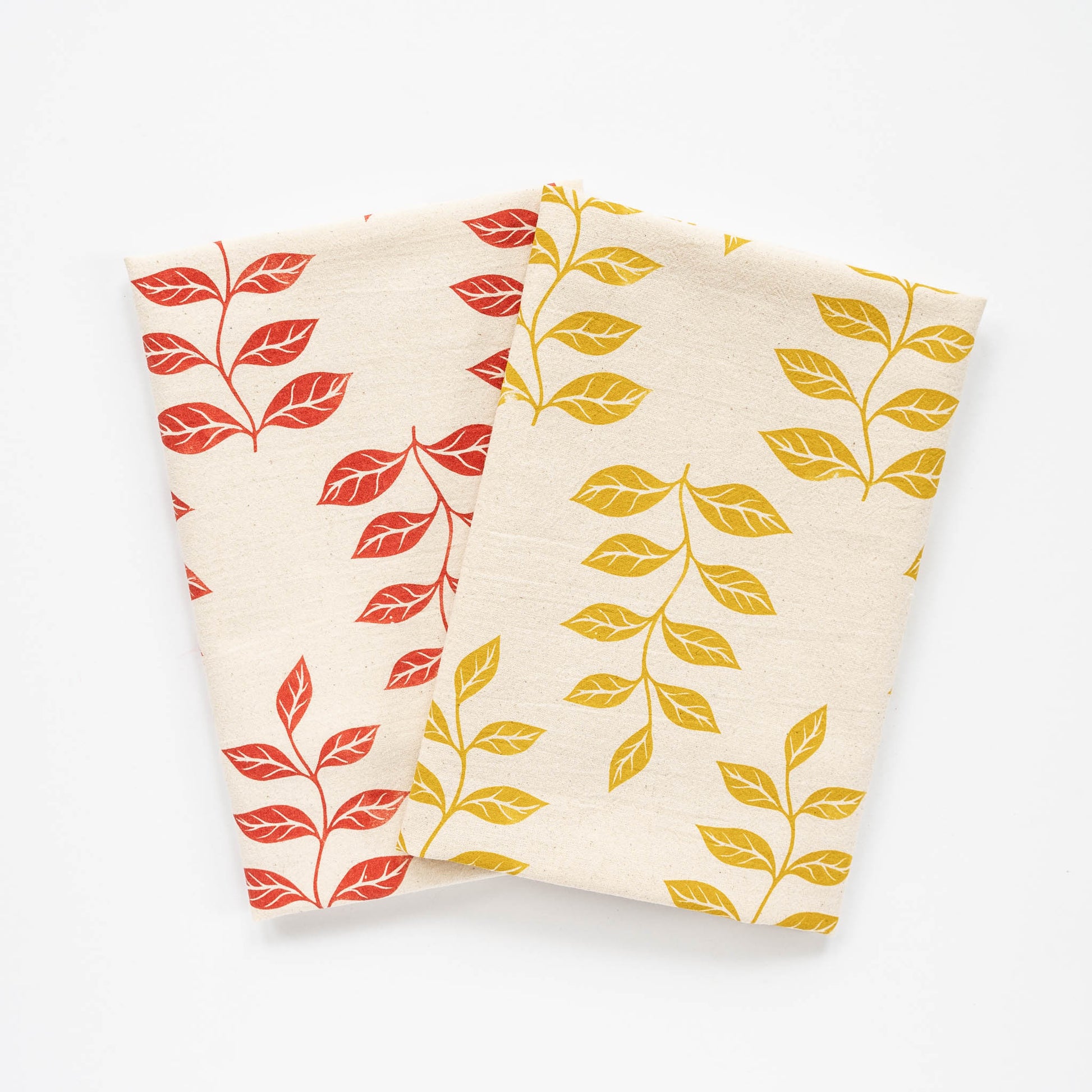Natural flour sack cotton tea towel printed with an all over leafy branch pattern. The design is inspired by a variety of leafy vines from the Maine woods. Available in gold or vermilion red. Add a pop of color to your kitchen with this nature-inspired tea towel.