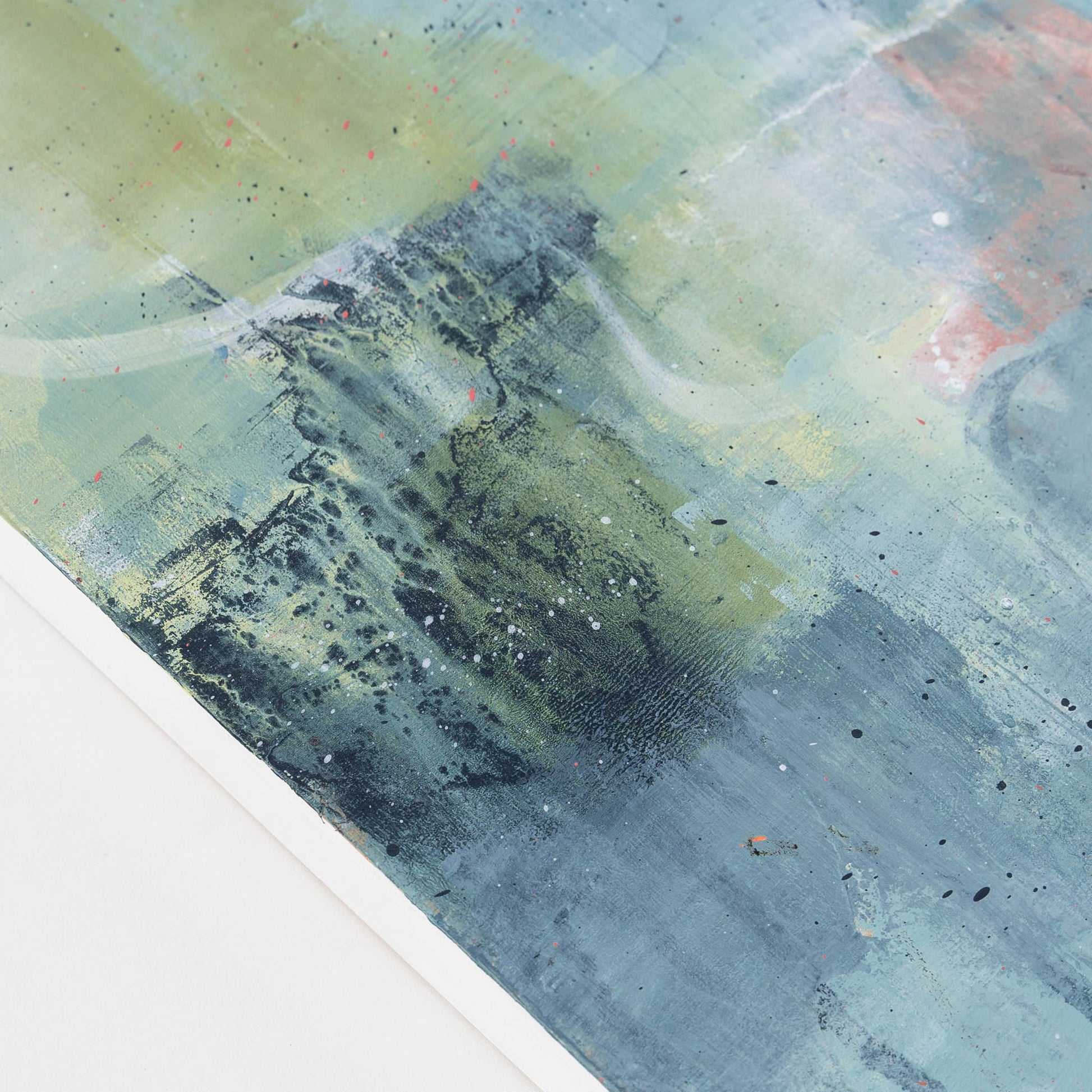 Drawing inspiration from misty mornings by the ocean, this painting consists of many layers of acrylic paint and ink applied using a variety of techniques. Each layer adds texture and a sense of history to the painting, creating many small, yet exciting moments to be discovered.