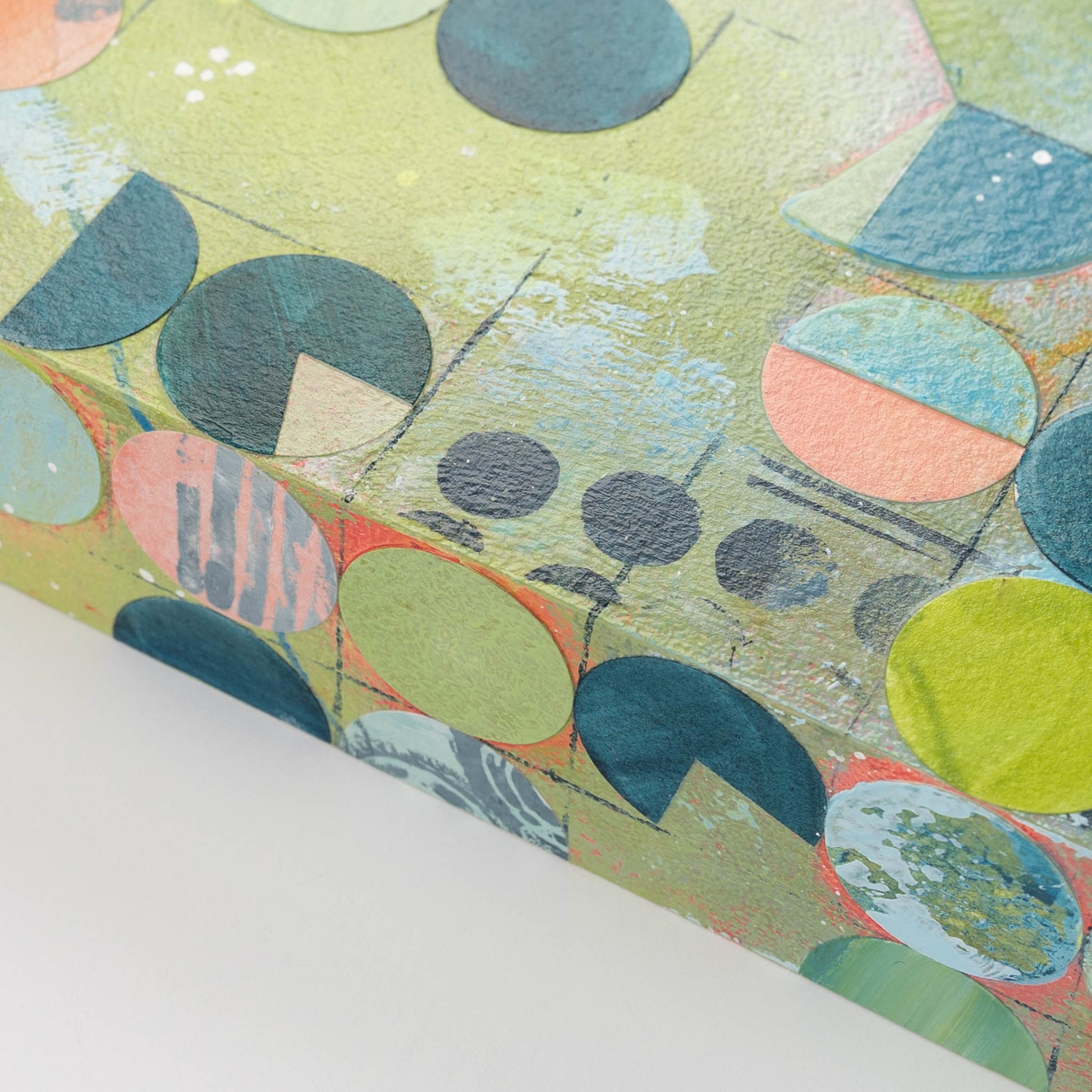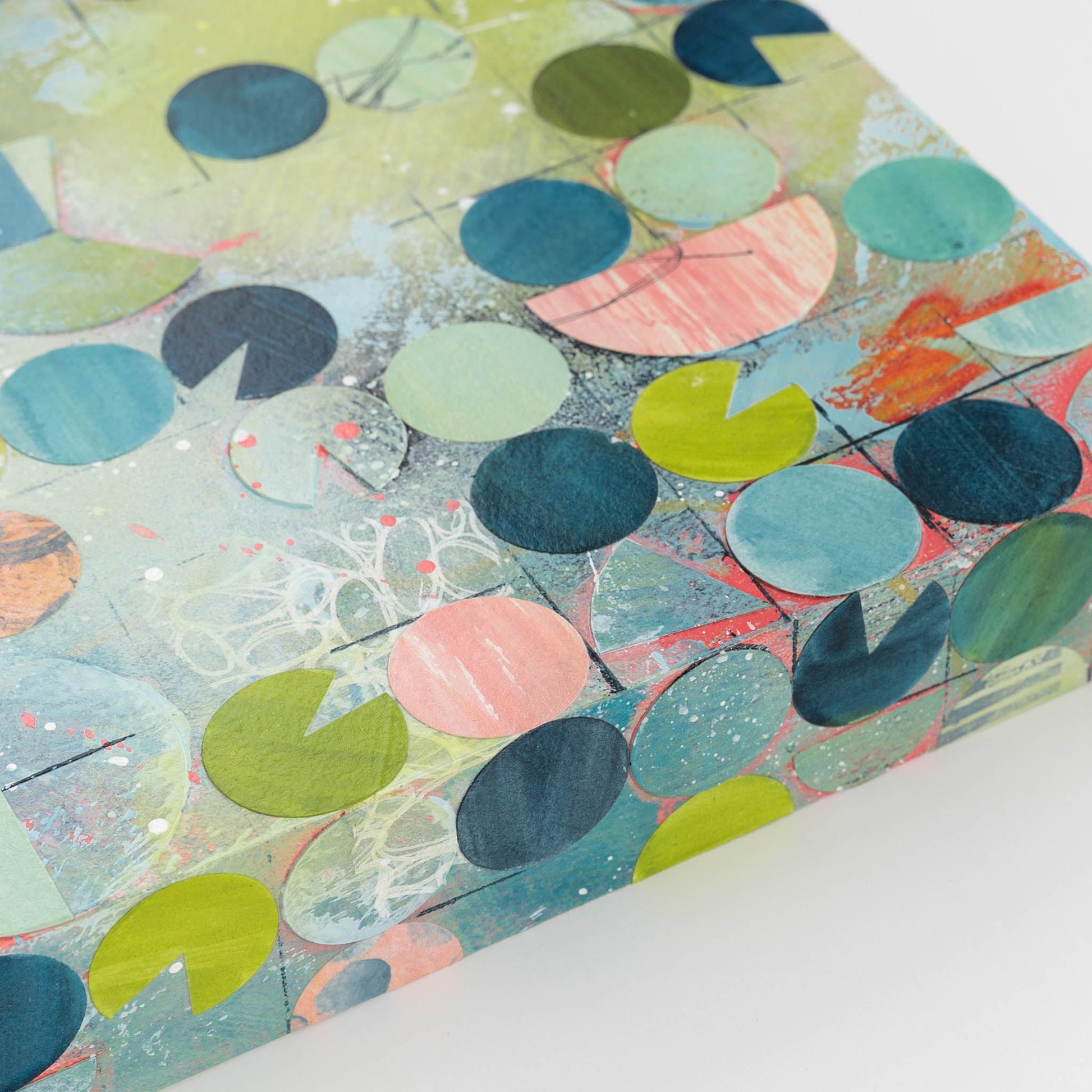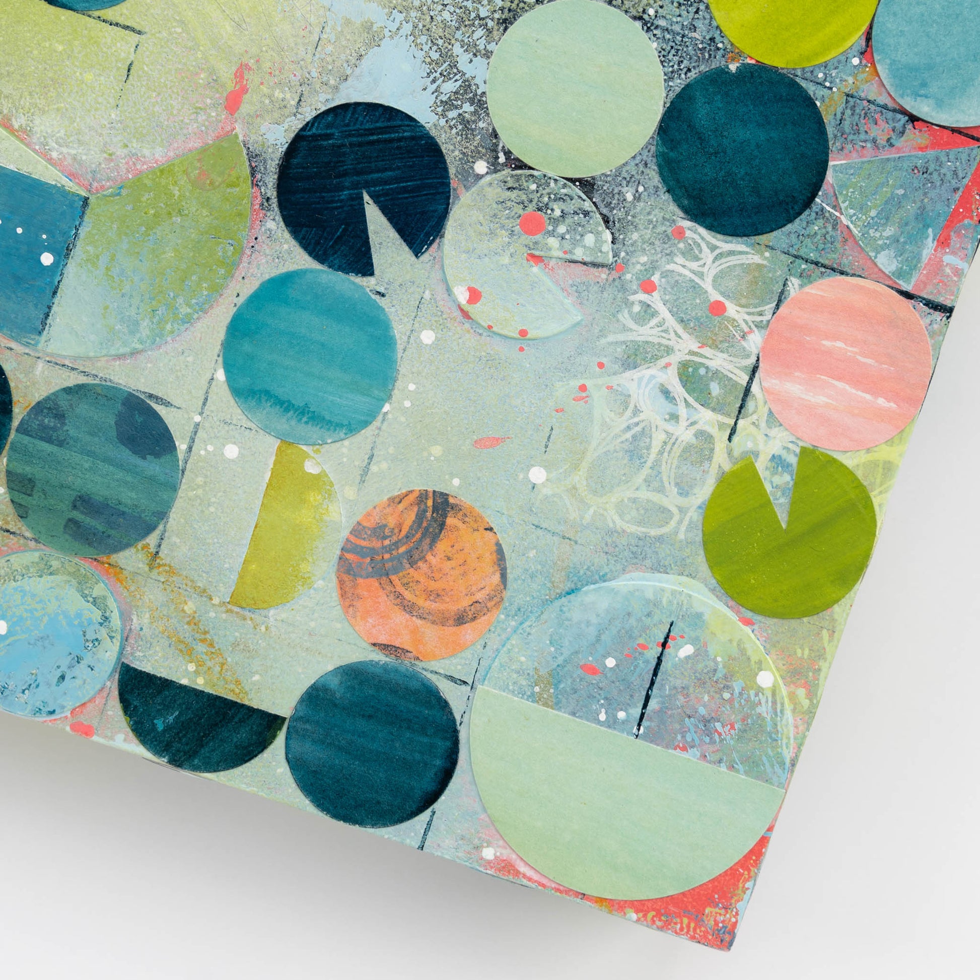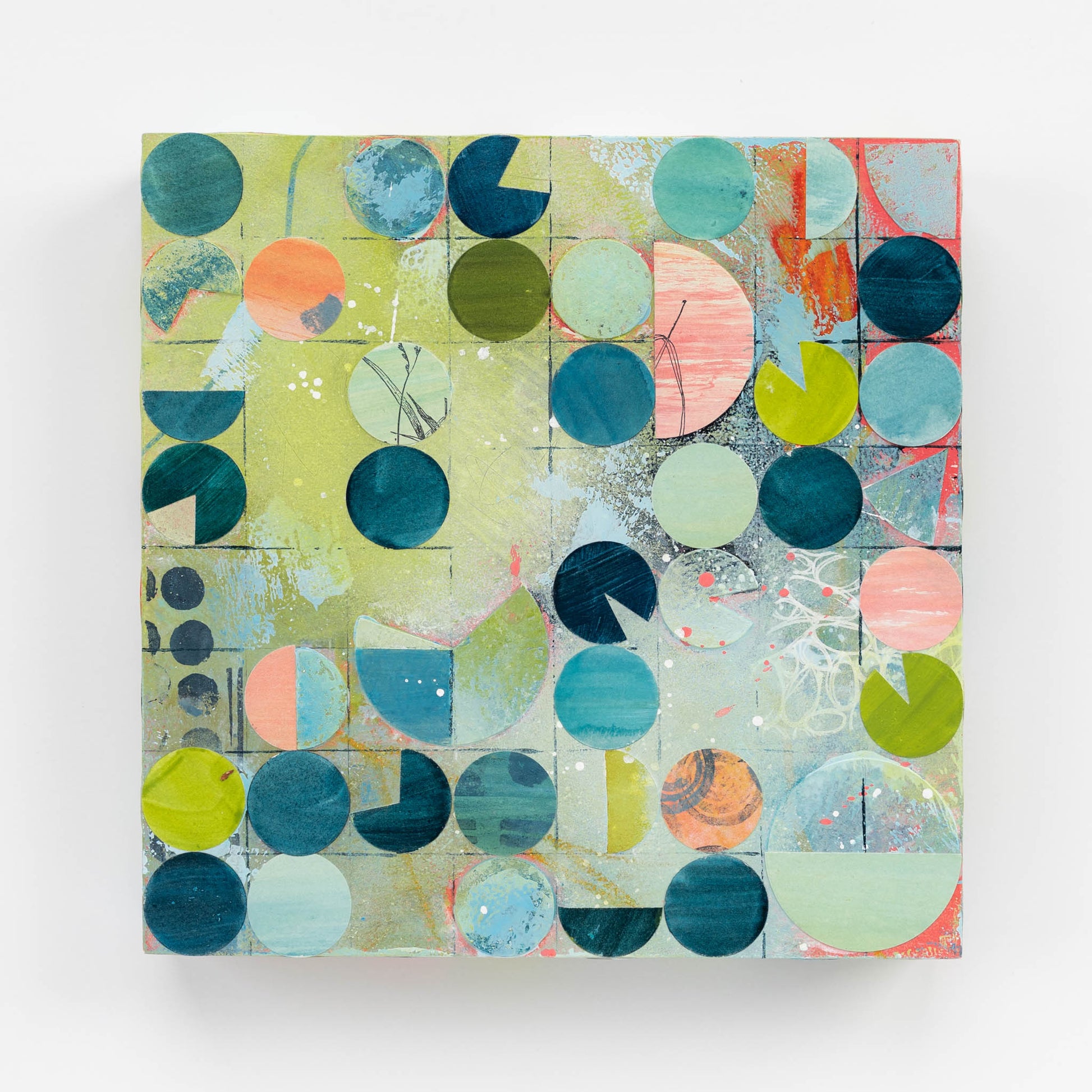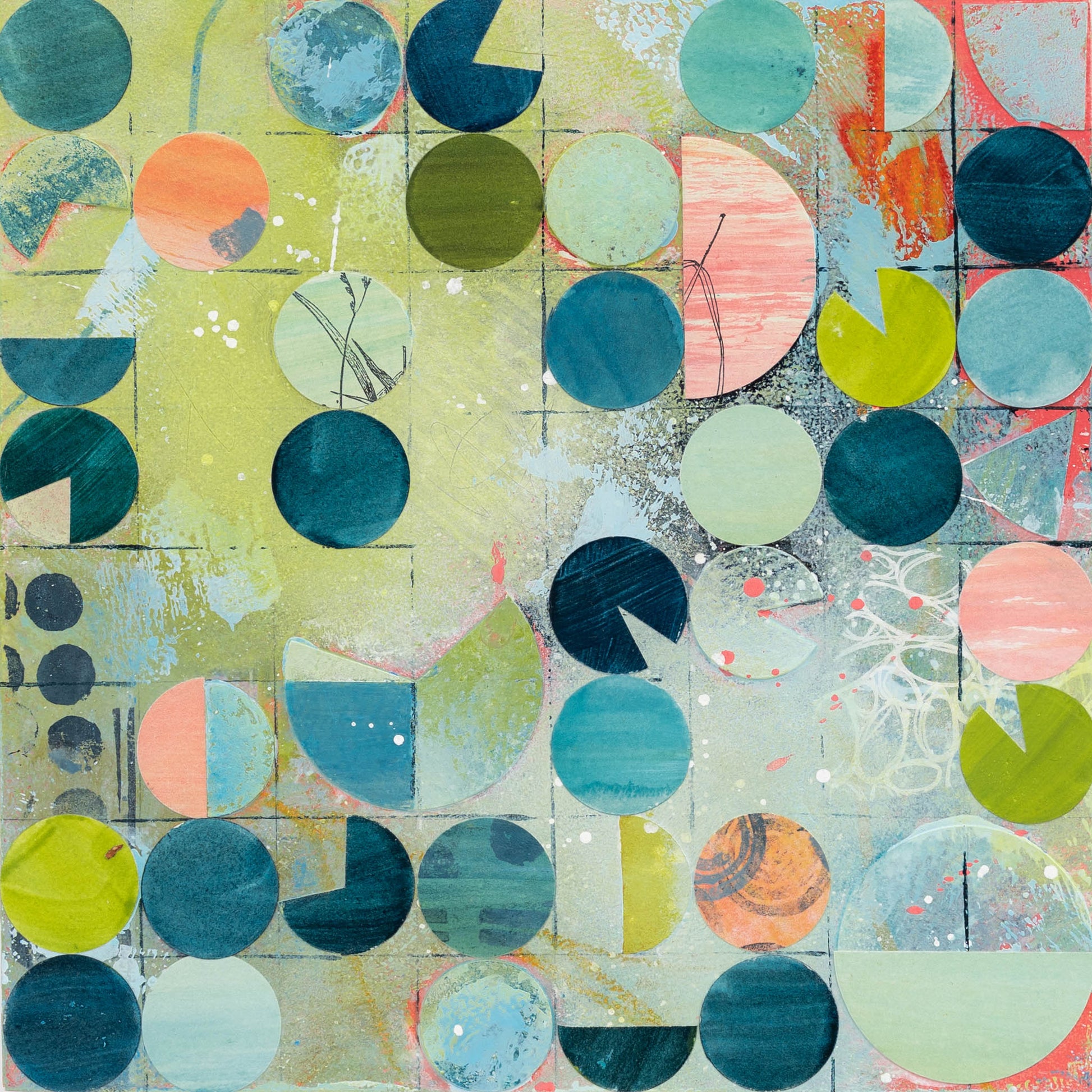 Roughly inspired by aerial images of center pivot irrigation fields, this painting marries my love of intuitive painting with the more logical and structured side of me that gravitates towards organized systems and patterns. Each circle is cut out, painted, and collaged onto the painting in between layers of acrylic paint and ink.