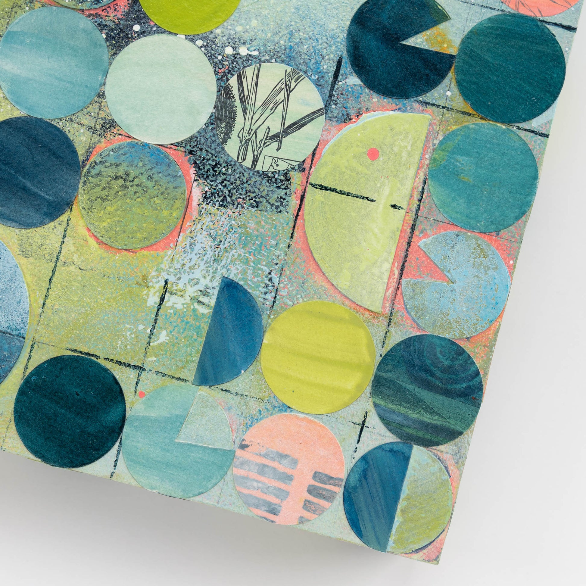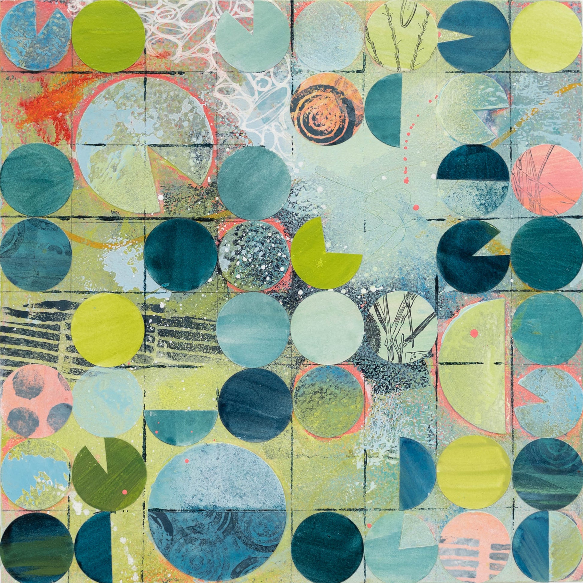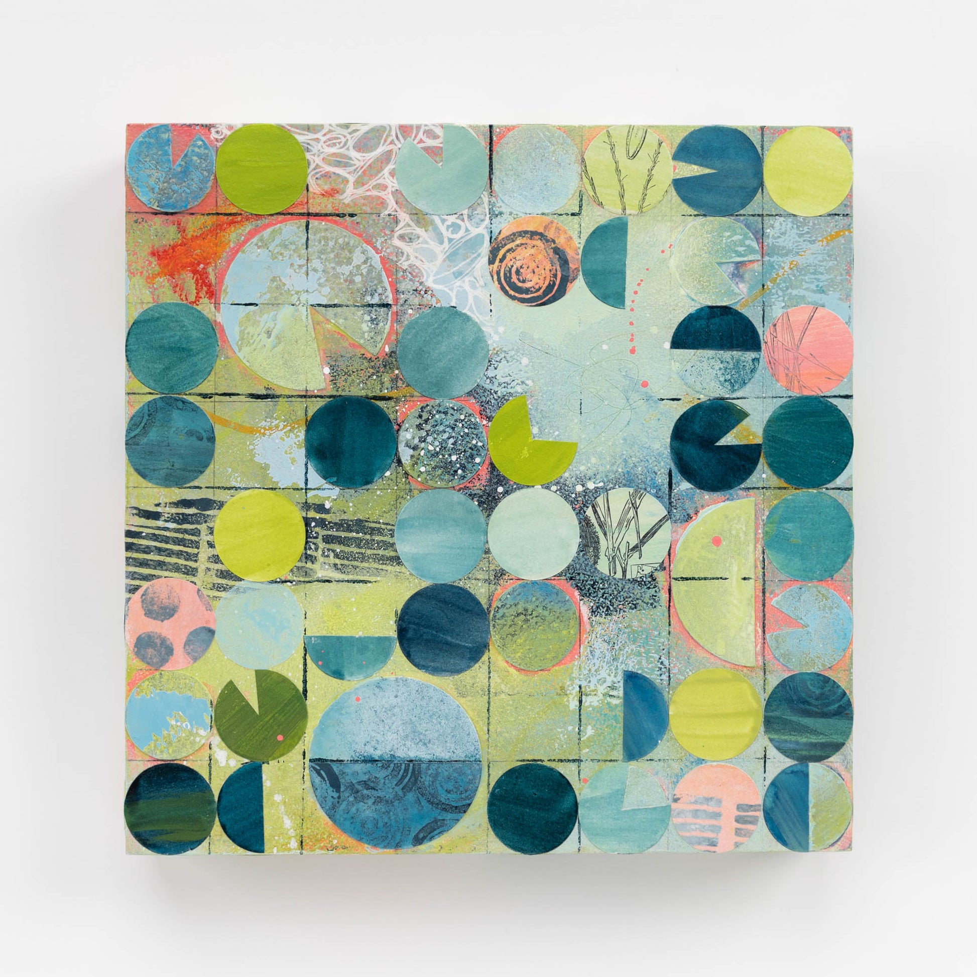 Roughly inspired by aerial images of center pivot irrigation fields, this painting marries my love of intuitive painting with the more logical and structured side of me that gravitates towards organized systems and patterns. Each circle is cut out, painted, and collaged onto the painting in between layers of acrylic paint and ink.