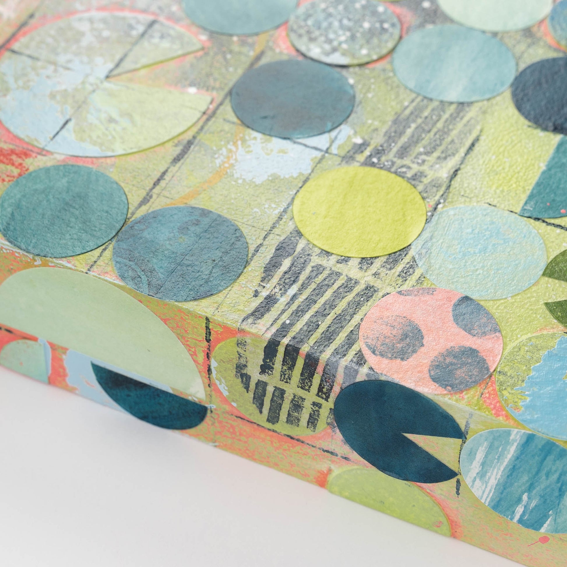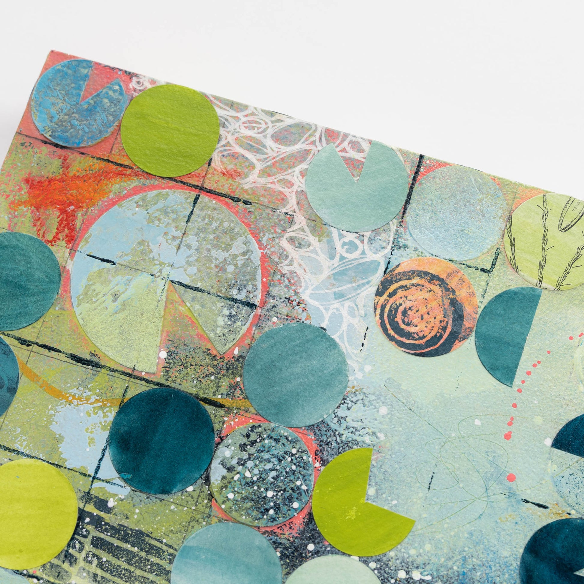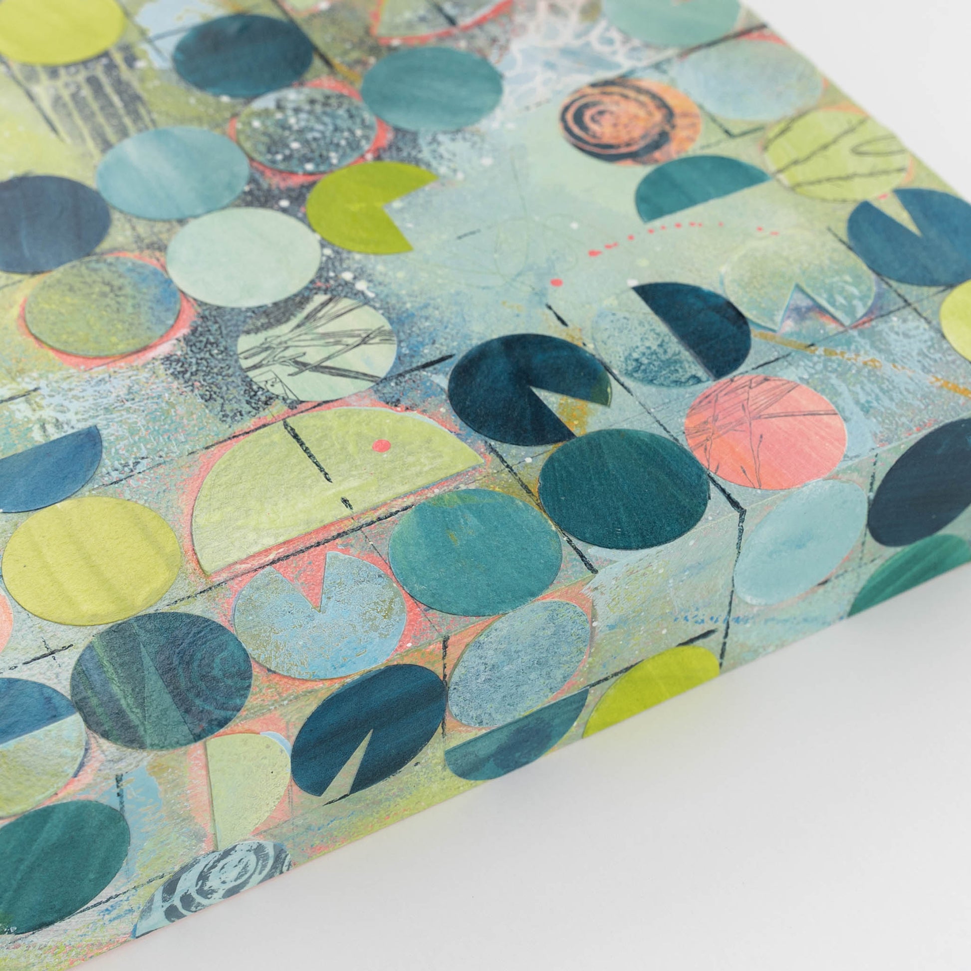 Roughly inspired by aerial images of center pivot irrigation fields, this painting marries my love of intuitive painting with the more logical and structured side of me that gravitates towards organized systems and patterns. Each circle is cut out, painted, and collaged onto the painting in between layers of acrylic paint and ink.