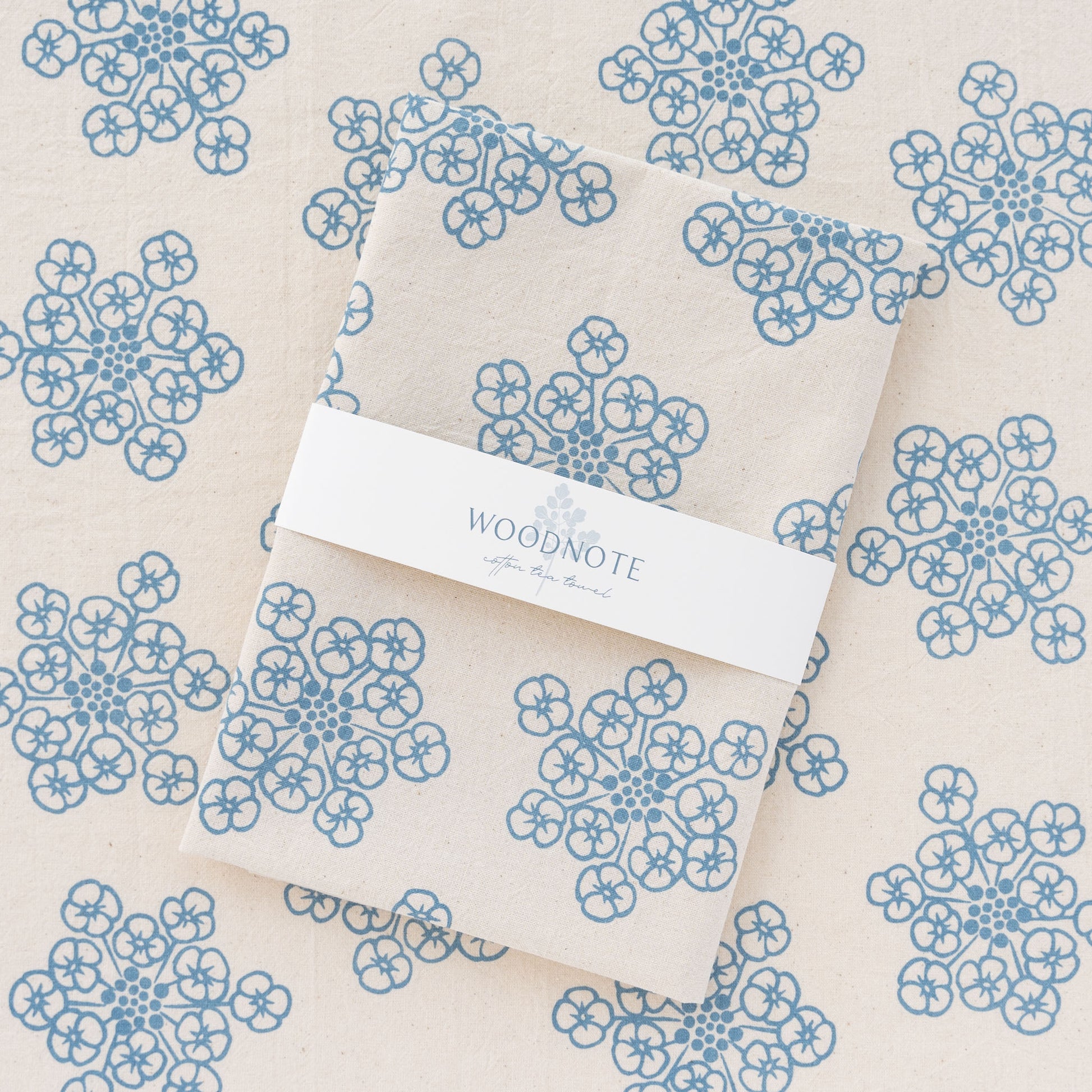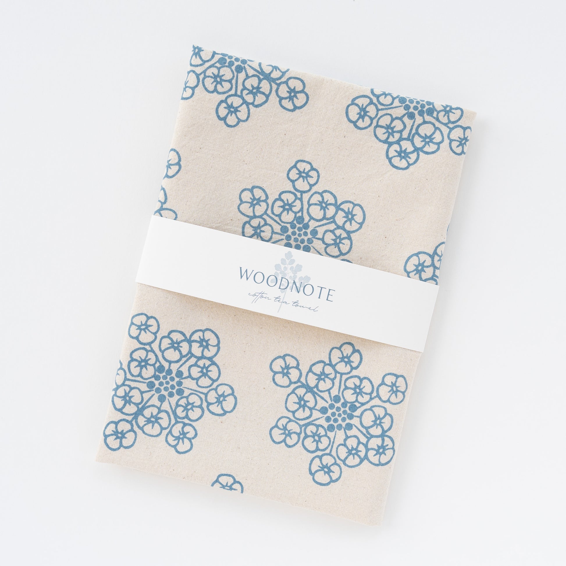 Natural flour sack cotton tea towel printed with an all over blue flower pattern. The design is part of the Woodnote Pollinator Garden series and is inspired by sweet Alison (or alyssum) flowers. Hand-printed in a lovely light blue. Tea towels are a great eco-friendly alternative to paper towels, plus they make great gifts!
