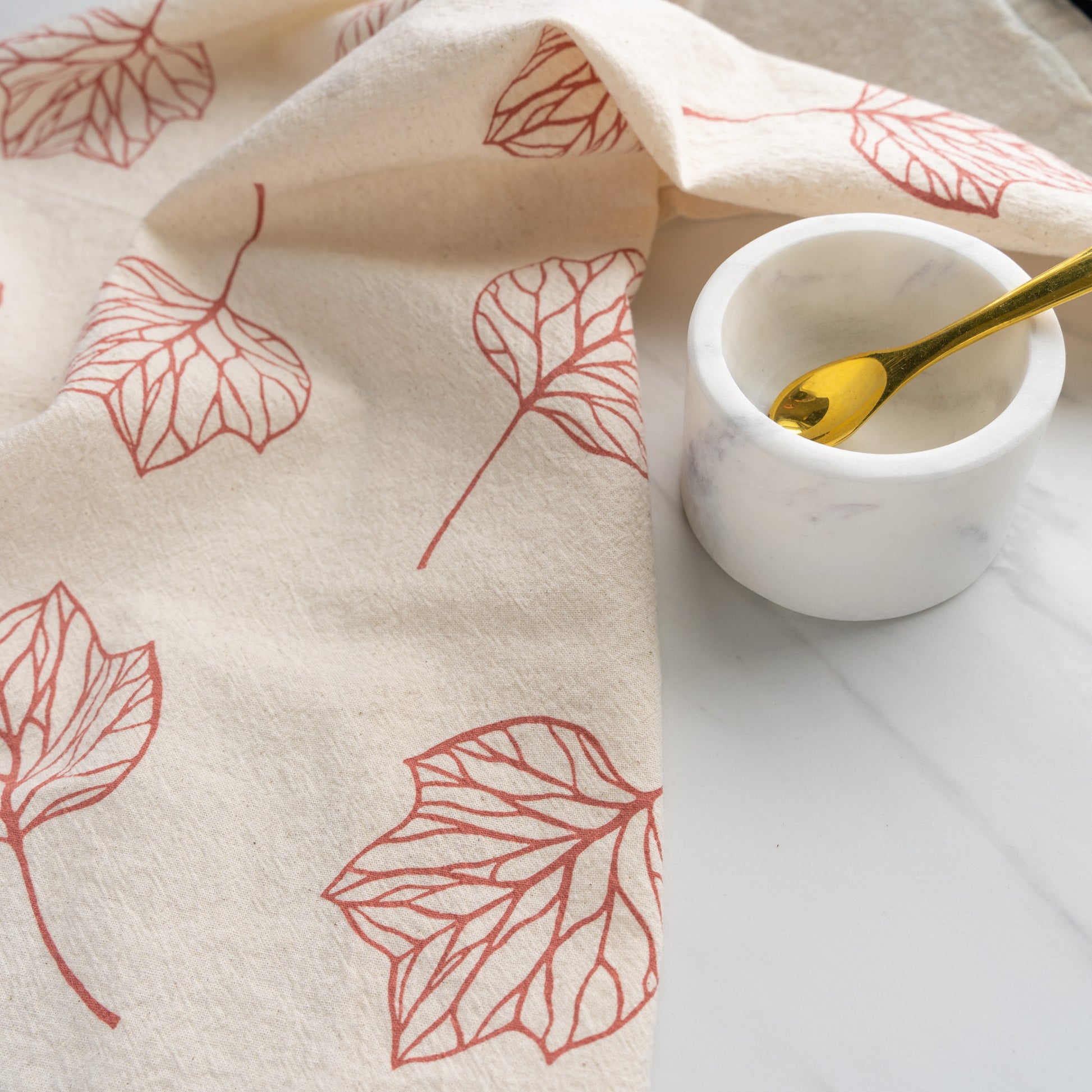 Natural flour sack cotton tea towel printed with an all over tulip leaf pattern. The design is based on an original block print and is hand screen-printed onto tea towels. Available in blue and coral. Makes a thoughtful gift for someone special or a fun treat for yourself.
