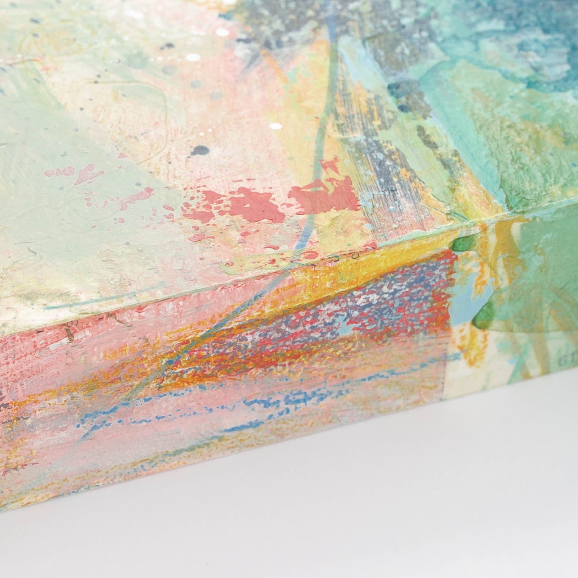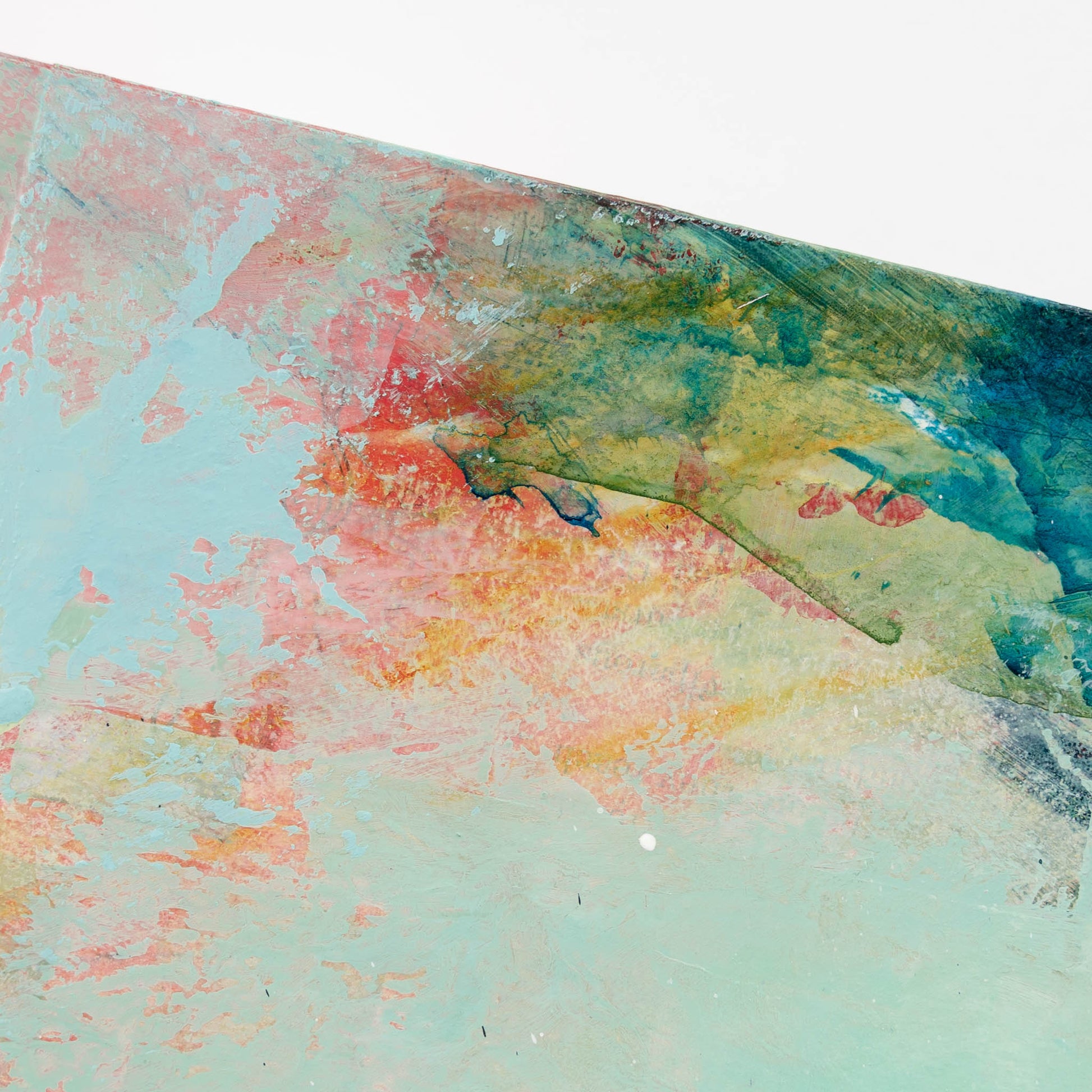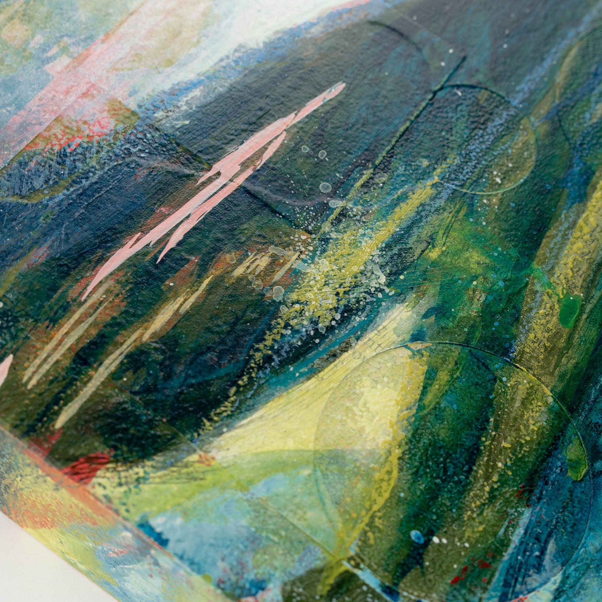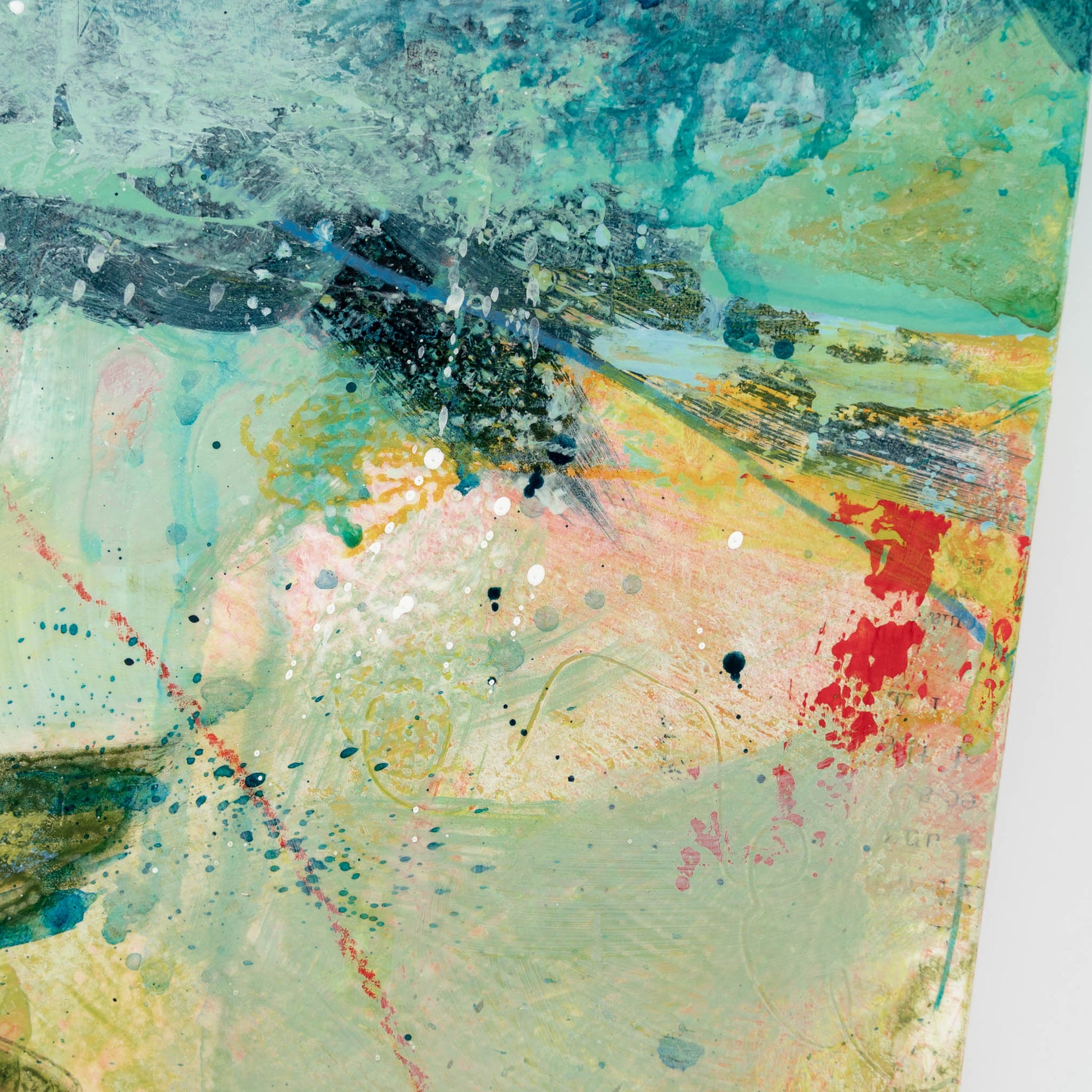 Paint, ink, and collage pieces were applied in layers to create this bold abstract landscape painting.
